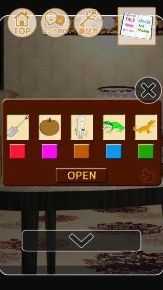 『喋る(シャベル)、無し(梨)、以下(イカ)、変える(蛙)、と影(トカゲ)』に合わせて開ける。