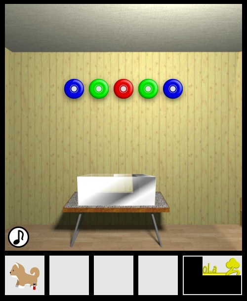 右に移動して、壁のフライングディスクの色『青緑赤緑青』を確認。