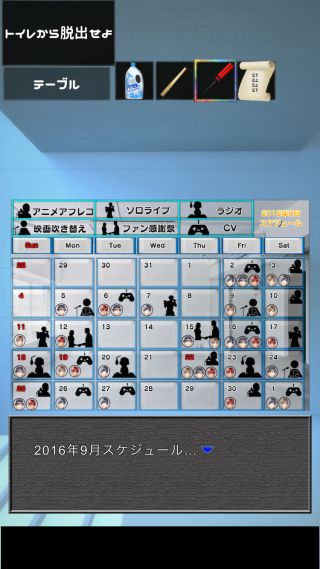 スケジュール表を拡大して、『千葉:ソロライブ、練馬:映画吹き替え、足立:ラジオ、品川:ファン感謝祭』の1人だけの予定を確認。