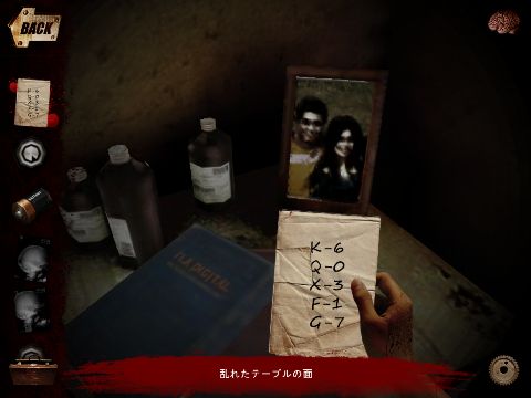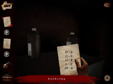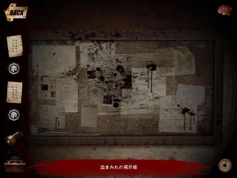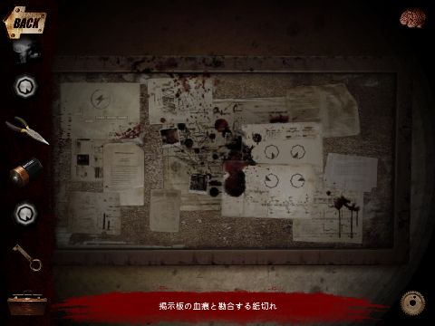 血まみれの掲示板に移動して、ベッドと床から入手した2枚の「メモ」を貼り付ける。