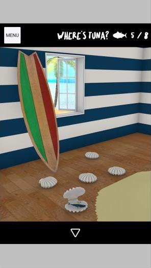 サーフボードそばの手前の貝殻の中から「マグロ」を入手。