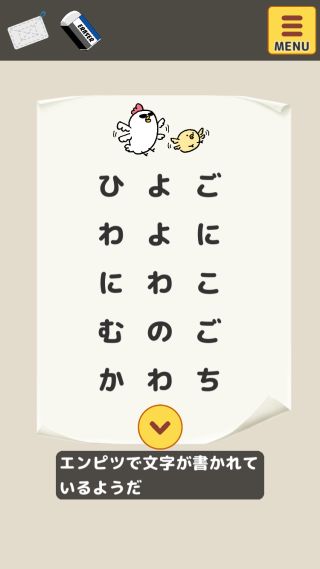 『にわとり→に、わを取る、消しゴム→ご、むを消す、ひよこ→ひの横を消す』