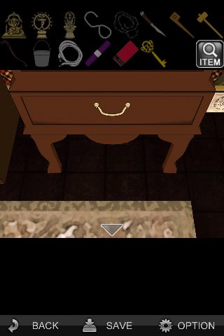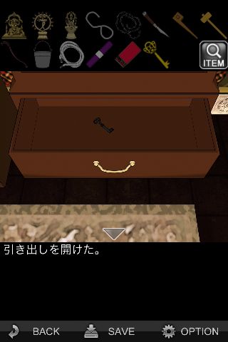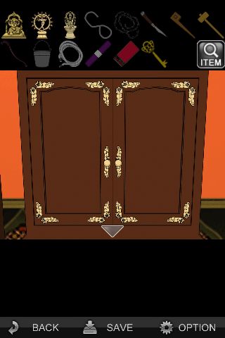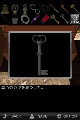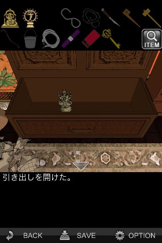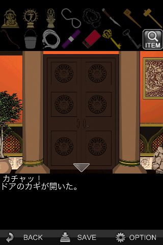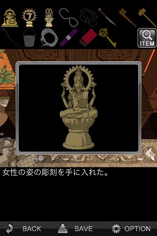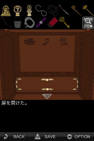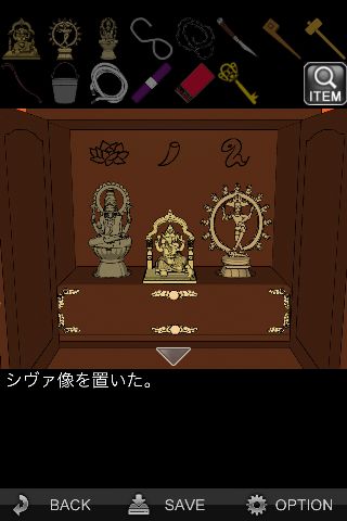 脱出ゲーム:狙われた旅人 無料 0 評価する 送信する IDAC CO.,LTD.(WaveA PTE.LTD.) 攻略その6 中から「女性の姿の彫刻」を入手。 右の棚へ。 扉を開ける。 3体の「彫刻」を左から「ラクシュミ」「ガネーシャ」「シヴァ」の順で置いて、下の引き出しへ。 中から「黒色のカギ」を入手。 右に移動する。 扉に「黒色のカギ」を使う。 脱出。 攻略その1 攻略その2 攻略その3 攻略その4 攻略その5 攻略その6