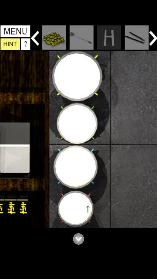 右の太鼓を拡大して、「スティック」を使って下から『赤1、青5、緑2、黄4』の回数叩く。