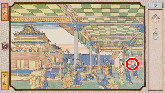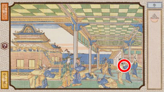右奥の女性をタップして、落ちた小判をタップしてクリア。