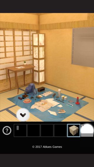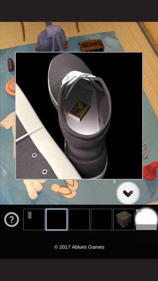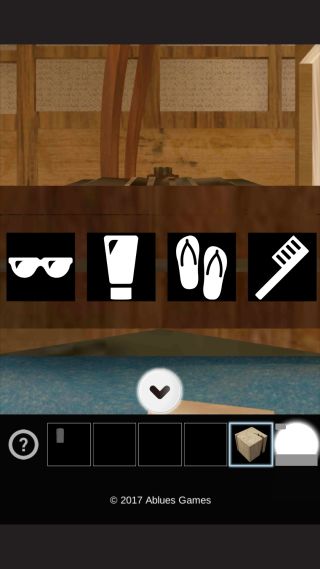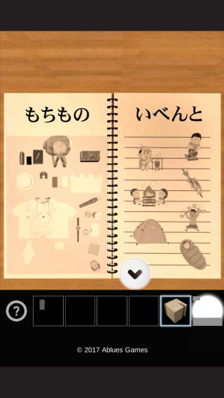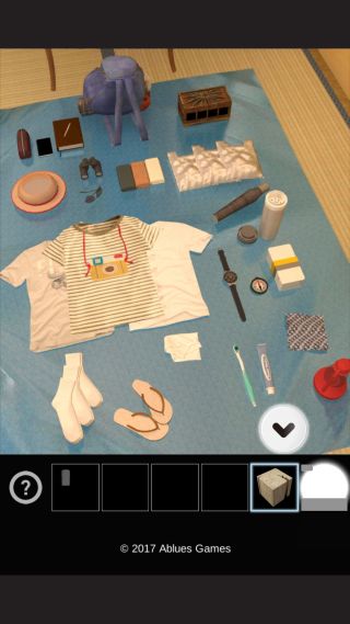 ブルーシート右上の箱を拡大して、『サングラス、草履、歯磨き粉、歯ブラシ』に合わせる。(順番はどれでもOK)