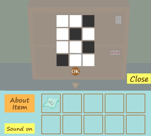 棚の左上の扉を拡大して、『ピンク、青、黄、ピンク、黄、黄、青』の順で押す。