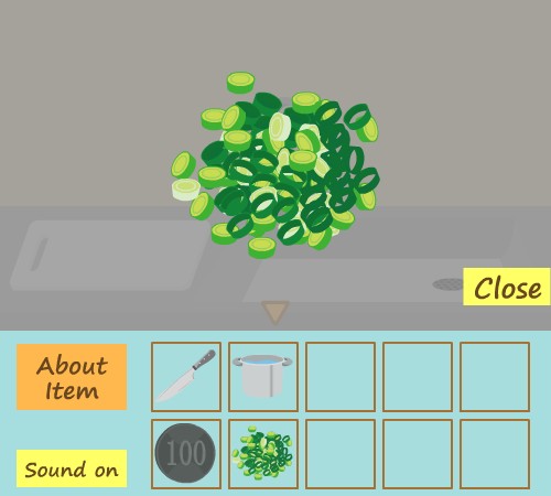 まな板に「ネギ」を置いて、「包丁」で切る。