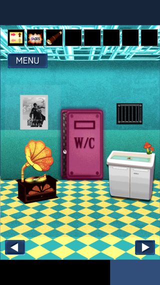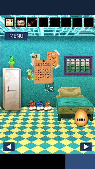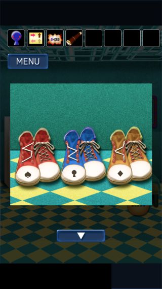 靴を拡大して、レバーのマークがある青い靴の靴紐が『左左右左右』なのを確認。