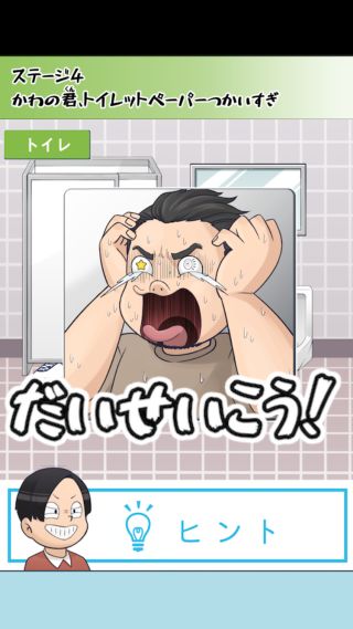 かわの君、いたずらをする - 脱出ゲーム 無料 5.0 評価する 送信する 株式会社サプライド ステージ4 かわの君、トイレットペーパーつかいすぎ トイレの扉を開ける。 トイレットペーパーを拡大して、下方向にフリックして全て出す。 そのまま待つ。 ステージ1 かわの君、先生の顔を白くする ステージ2 かわの君、校長先生にひげをはやす ステージ3 かわの君とバナナの皮 ステージ4 かわの君、トイレットペーパーつかいすぎ ステージ5 かわの君、校長先生のひみつをあばく いじげん編 ステージ1 いじげんと先生 ステージ2 こわれる壁 ステージ3 とべ、少年! ステージ4 もとにもどす ステージ5 かわの君、先生の顔を白くする じごく編 ステージ1 じごくの入り口 ステージ2 やみ ステージ3 とべ、バナナ! ステージ4 そうじ ステージ5 じごくのおわり