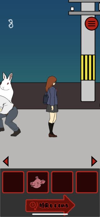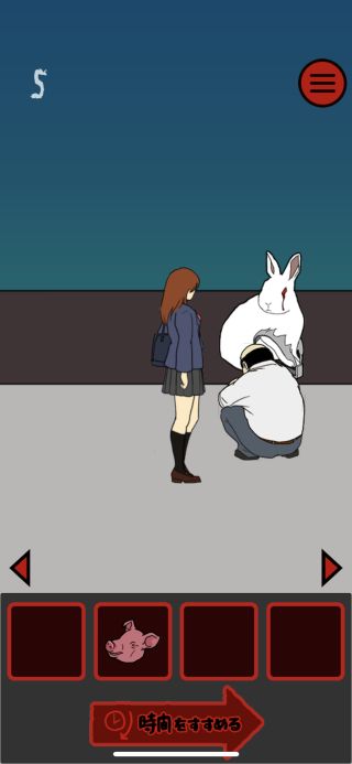 私の背骨を守って 無料 4.5 評価する 送信する Ohaglow STAGE 5 右にスクロールさせて、ウサギの前へ。 ウサギの2つ前に「罠」を置いて、『5回』時間を進めると男がウサギを助ける。 『3回』時間を進めて、左に「豚の頭」を置く。 そのまま時間を進めて、帰宅させる。 STAGE 1 STAGE 2 STAGE 3 STAGE 4 STAGE 5 STAGE 6 STAGE 7 STAGE 8 STAGE 9 STAGE 10 ホラーエンドの出し方