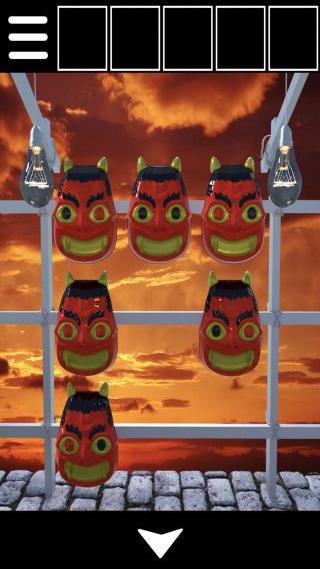 右の鬼のお面を拡大して、赤と黒の目の配置を確認。