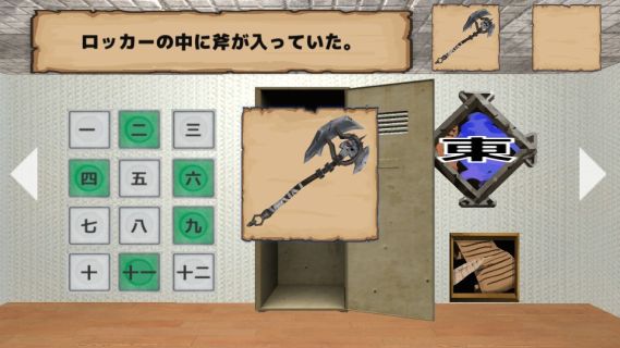 反対側に移動して、『ニ、四、六、九、十一』を押して「斧」を入手。