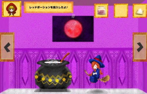 反対側に移動して、鍋に「レッドポーション」を入れる。