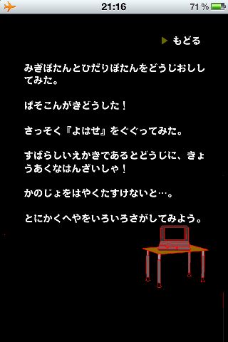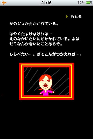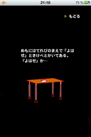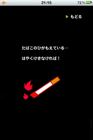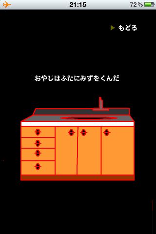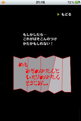 おやじのだっしゅつげーむ 無料 5.0 評価する 送信する 攻略その1 『4のへや』に移動して、「たばこ」を調べる。 『3のへや』に移動して、本棚の右下にある「ぺっとぼとるのふた」を調べる。 『2のへや』に移動して、「きっちん」で水を汲む。 『4のへや』に移動して、「たばこ」の火を消す。 「でんわ」を調べる。 『1のへや』に移動して、「かのじょのえ」を調べる。 左下にある「かみくず」を調べる。 『3のへや』に移動して、「ぱそこん」を調べる。 『1のへや』に移動して、「つくえのうえのめも」を調べる。 『4のへや』に移動して、「てれび」を調べる。 攻略その1 攻略その2 攻略その3