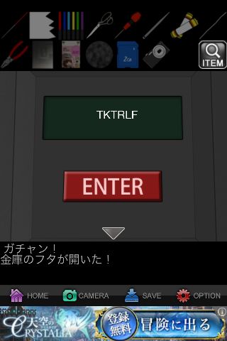 脱出ゲーム: 死にゆく者に永遠を 無料 0 評価する 送信する IDAC CO.,LTD.(WaveA PTE.LTD.) 攻略その10 装置に『TKTRLF』を入力。 中から「カギ」を入手。 右に移動。 このまま脱出するとバッドエンドへ。 左下の椅子のマットを調べる。 マットをめくって屋上のカギを入手。(所持品欄には加えられない) 扉に「カギ」を使う。 脱出。 攻略その1 攻略その2 攻略その3 攻略その4 攻略その5 攻略その6 攻略その7 攻略その8 攻略その9 攻略その10