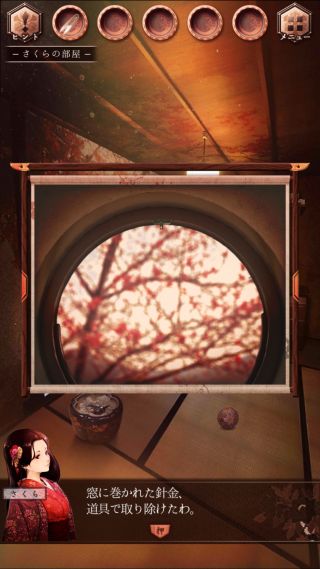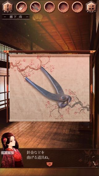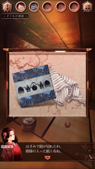 「糸切りばさみ」を使って、「紙」に書かれた『櫛、折り鶴、ヤカン、折り鶴、櫛』を確認。