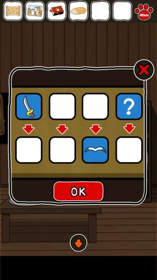 棚の左上にある箱を拡大して、『剣→魚、望遠鏡→ちくわ、カモメ→カモメ、?→カニ』に合わせる。