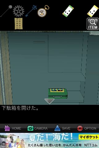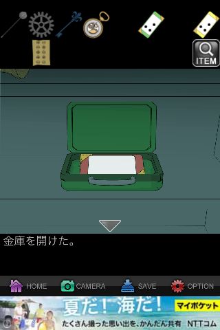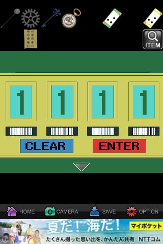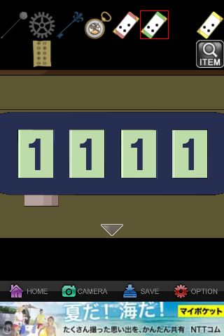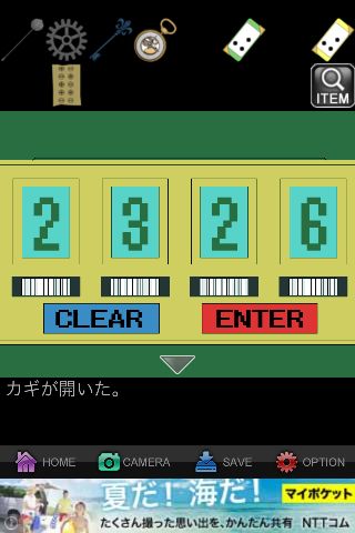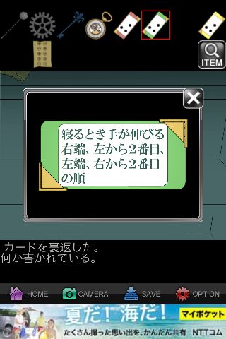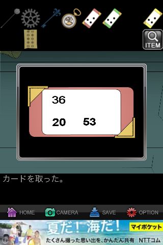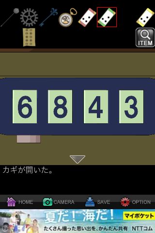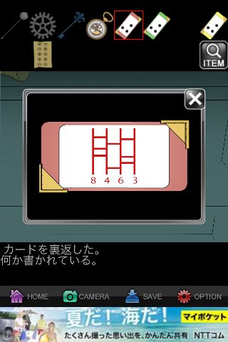 「赤いカード」と「緑のカード」を裏返して、あみだくじを解くと『6843』となる。