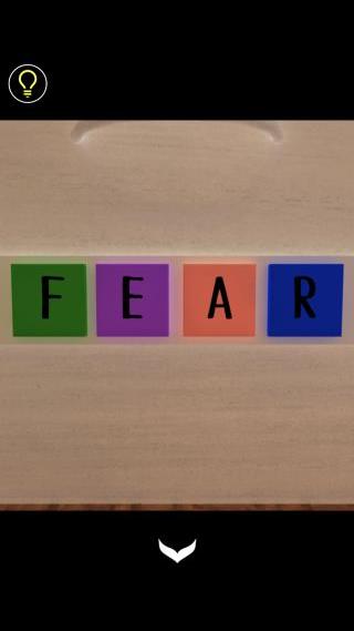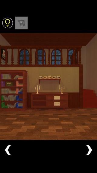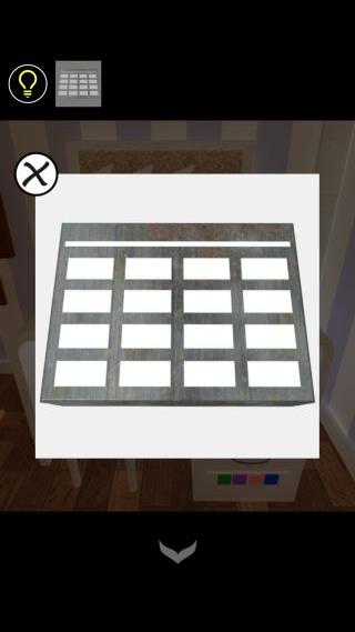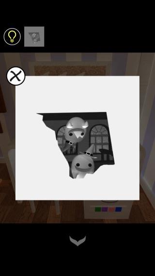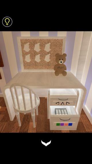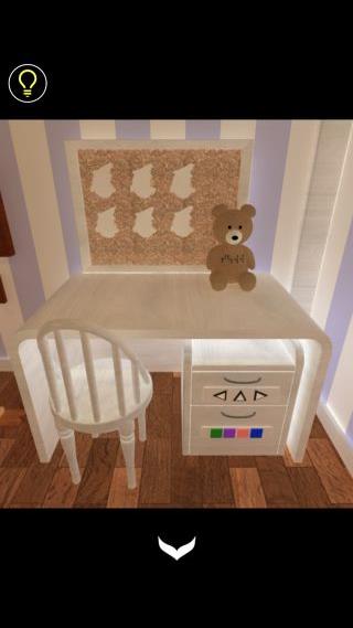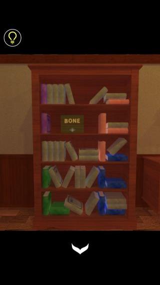 ここのヒントは、前の部屋の本棚にある4色の本の並びがアルファベットになっている。
