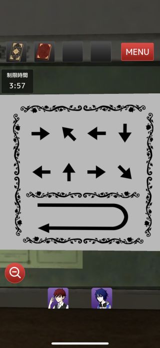 壁の暗号を拡大して、『右、左上、左、下、右下、右、上、左』を確認。