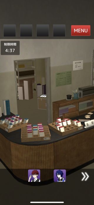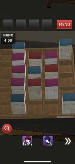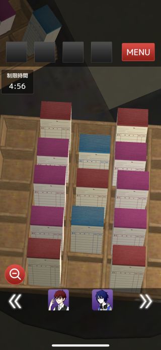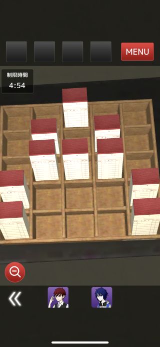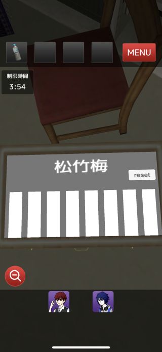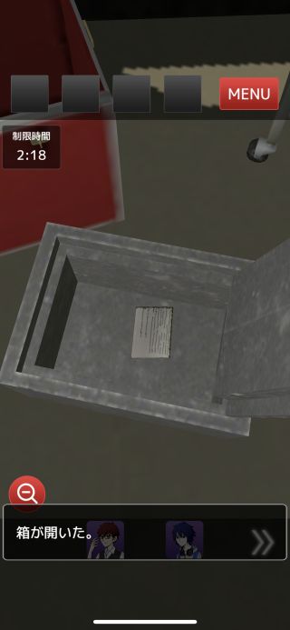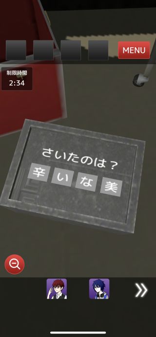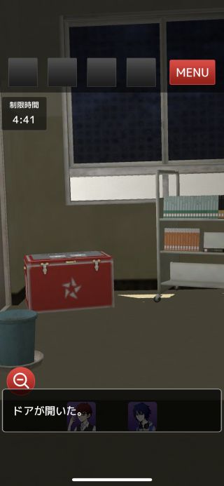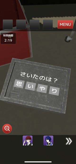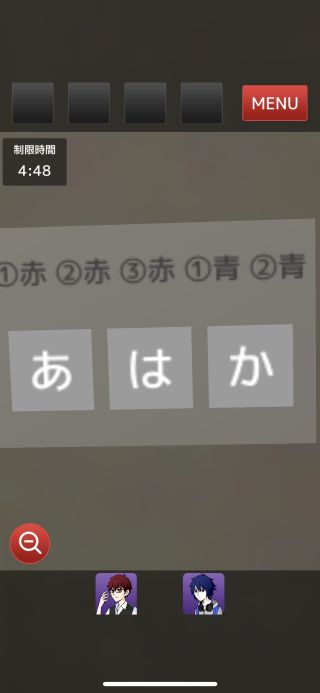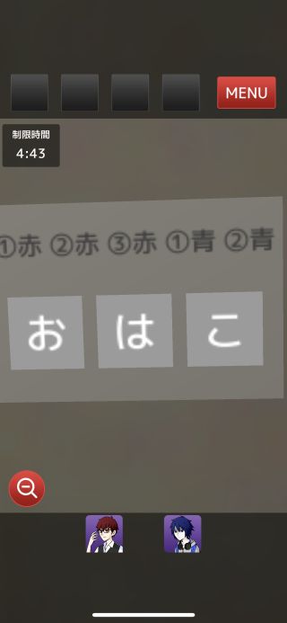 扉の装置を拡大して、『①赤=O、②赤=H、③赤=A、①青=K、②青=O』なので『OHAKO=おはこ』に合わせる。