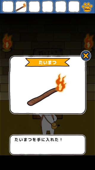 壁の松明で火をつけて、「たいまつ」を入手。