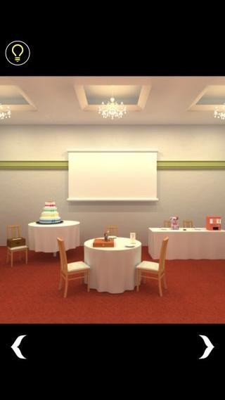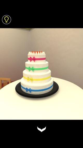左奥のテーブルの上を拡大して、ケーキの色が上から『赤緑黄青』なのを確認。