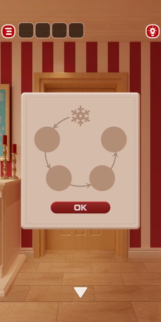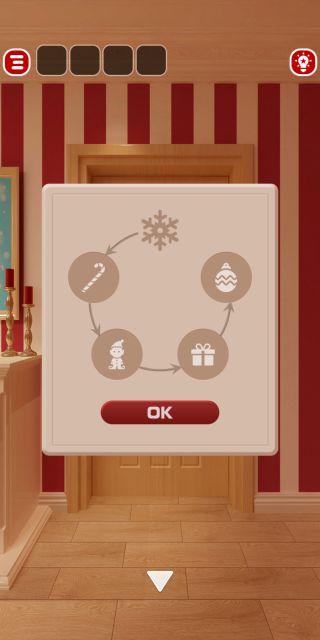 妖精が移動した順『雪の結晶→ステッキ→小人→プレゼントの箱→玉の飾り』に合わせる。