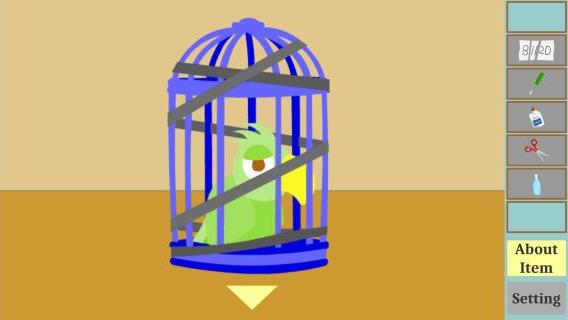 鳥かごを拡大して、「ハサミ」でヒモを切る。