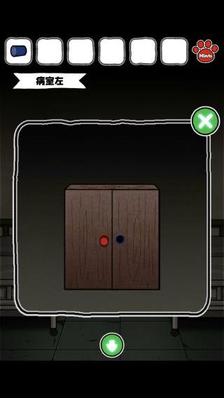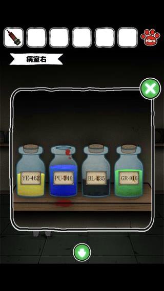 左の棚を拡大して、青いビンに「注射器」を使う。