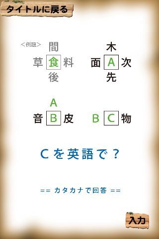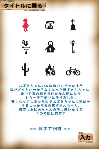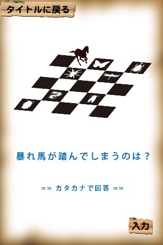 悪魔からの挑戦状 無料 0 評価する 送信する 土の妖精 攻略 第1問 『A=目』、『B=頭』、『C=金』。 『金=マネー』ではないので注意。 第2問 白い部分が『0』、黒い部分が『1』と考える。 魚までのパネルは『0101101』になるので、これを二進法で表す。 第3問 チェスを知っていればすぐに分かる問題。 馬は『ナイト』で、動ける範囲はアルファベットの『Y』を4方向に広げたような動きになる。 第4問 文章のキーワードに添って上の記号を結んでいくと、数字になる。 水の妖精 攻略 火の妖精 攻略 木の妖精 攻略 土の妖精 攻略 金の妖精 攻略