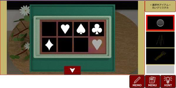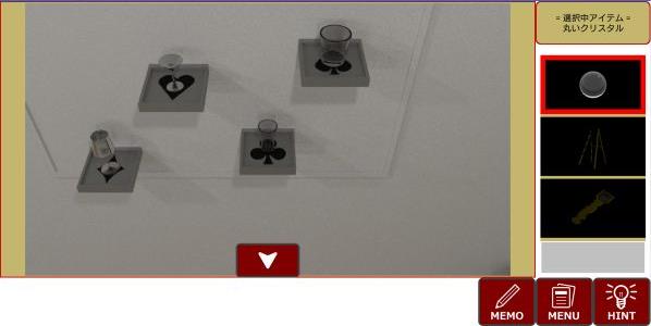 壁のグラスを調べて、先ほどの箱の中の配置にトランプのスートを合わせていく。