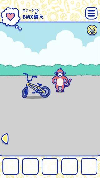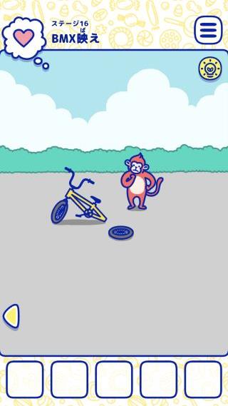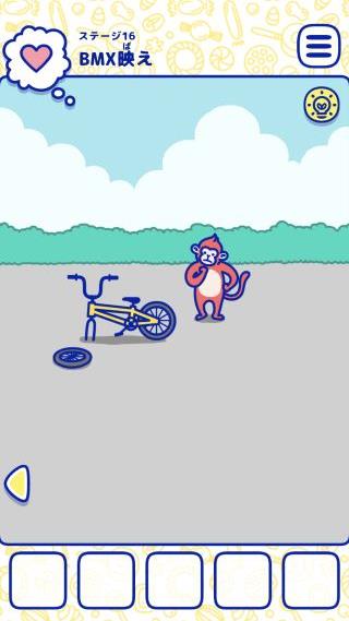 脱出ゲーム ハッピーキャンディ 無料 4.1 評価する 送信する THE STRIPPERS Co., Ltd ステージ16 BMX映え 右に移動。 「タイヤ」を入手して、自転車に付ける。 前輪を数回タップして外して、左に移動。 カメラボタンを押す。 ステージ01 ボールで遊びたい ステージ02 ボールで遊びたい2 ステージ03 スケボー映え ステージ04 アメがほしい ステージ05 風船とって ステージ06 ボールとりたい ステージ07 流れ星みたい ステージ08 金のオノ銀のオノ ステージ09 スケート映え ステージ10 トイレ行きたい ステージ11 おやつの時間 ステージ12 リンゴ食べたい ステージ13 グッズ買いたい ステージ14 注射怖い ステージ15 ブーケとりたい ステージ16 BMX映え ステージ17 マキ割り ステージ18 怪盗キャンディ ステージ19 ババぬき ステージ20 クリ拾い ステージ21 クレーンゲーム ステージ22 モモ狩り ステージ23 かくれんぼ ステージ24 落ちる コレクション No.001~010 コレクション No.011~020 コレクション No.021~030 コレクション No.031~040 コレクション No.041~050 コレクション No.051~060 コレクション No.061~070 コレクション No.071~080 コレクション No.081~090 コレクション No.091~100 コレクション No.101~110 コレクション No.111~121 キャラクター No.001~016 キャラクター No.017~031