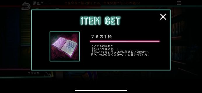 右の青い引き出しを調べて、「フミの手帳」を入手。