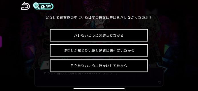 絶望プリズン 無料 4.4 評価する 送信する STUDIO WASABI 第4回 審議 『事件の前にすでに書かれていた』を選択する。 『文字の上に紙を貼り隠していた』を選択する。 『犯人は犯行時に体育館の中に居たから』を選択する。 『バレないように変装してたから』を選択する。 第1章 絶望の始まり 探索パート その1 探索パート その2 探索パート その3 第1回 審議 第1回 絶望裁判 第2章 道化の嘘 探索パート その1 探索パート その2 探索パート その3 第2回 審議 第2回 絶望裁判 第3章 虎の目にも涙 探索パート その1 探索パート その2 第3回 絶望裁判 第4章 絆と疑心 探索パート その1 探索パート その2 第5章 謎の少女 探索パート その1 探索パート その2 探索パート その3 探索パート その4 第4回 審議 第4回 絶望裁判 第6章 絶望プリズン 探索パート 第5回 審議