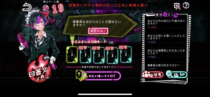 絶望プリズン 無料 4.4 評価する 送信する STUDIO WASABI 第4回 絶望裁判 核心カード Lv.1 『あなたは理事長の娘ですか?』 核心カード Lv.2 『理事長はあなたのことを認めていますか?』 穴埋め回答文 ① 黒木フミ ② 自由を許さない姿勢 ③ 名誉を傷つける ④ 復讐 第1章 絶望の始まり 探索パート その1 探索パート その2 探索パート その3 第1回 審議 第1回 絶望裁判 第2章 道化の嘘 探索パート その1 探索パート その2 探索パート その3 第2回 審議 第2回 絶望裁判 第3章 虎の目にも涙 探索パート その1 探索パート その2 第3回 絶望裁判 第4章 絆と疑心 探索パート その1 探索パート その2 第5章 謎の少女 探索パート その1 探索パート その2 探索パート その3 探索パート その4 第4回 審議 第4回 絶望裁判 第6章 絶望プリズン 探索パート 第5回 審議