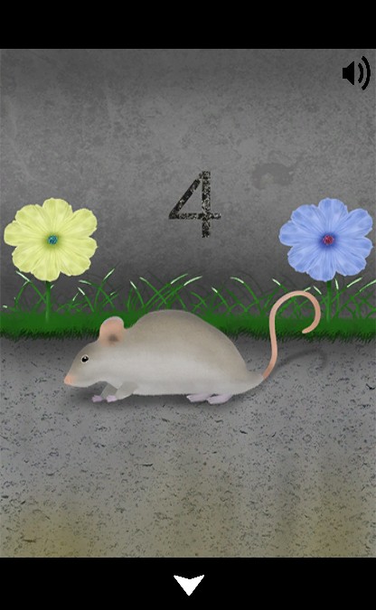 右のネズミを調べて、向いていない方の花の色『4=青』を確認。
