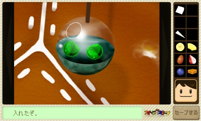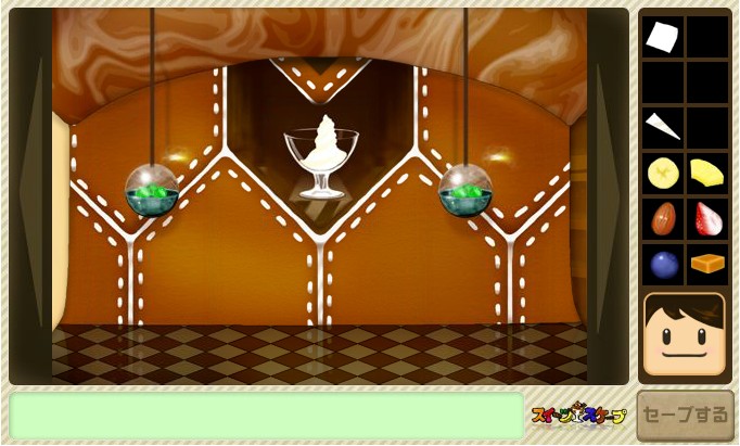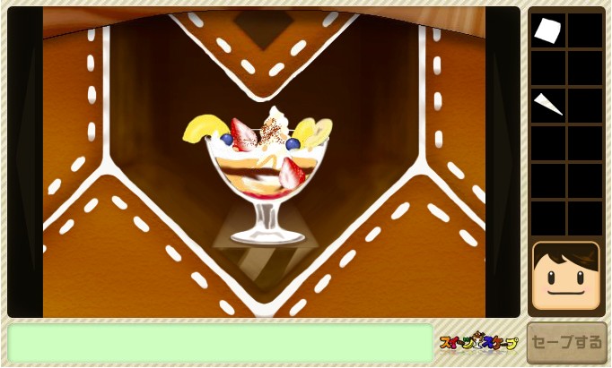 中央のパフェの器に「バナナ」「パイン」「アーモンド」「ストロベリー」「ブルーベリー」「キャラメル」を入れて、パフェを完成させて脱出。