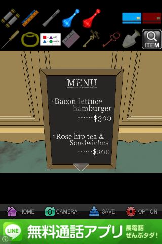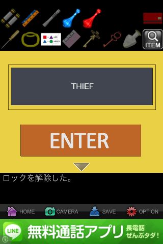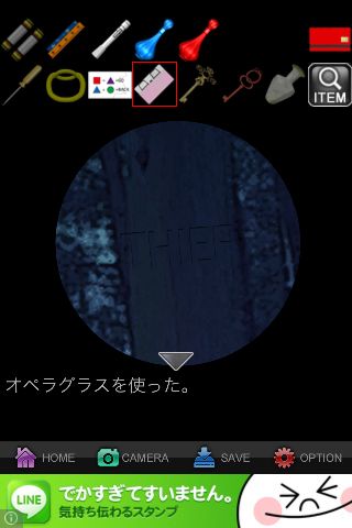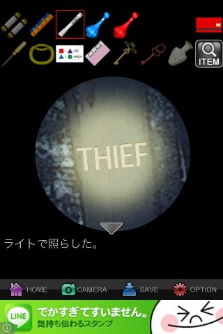 「オペラグラス」で覗いて、「ライト」を使って『THIEF』を確認。