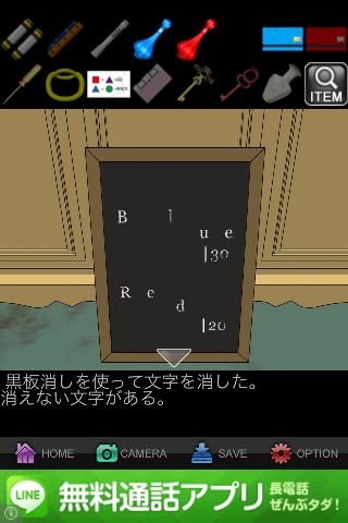 看板を「黒板消し」で消すと、『Blue 130 Red 120』の文字が残る。
