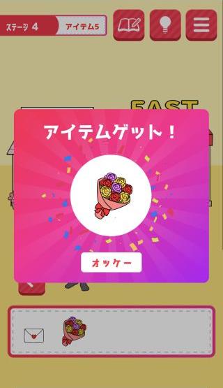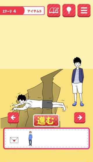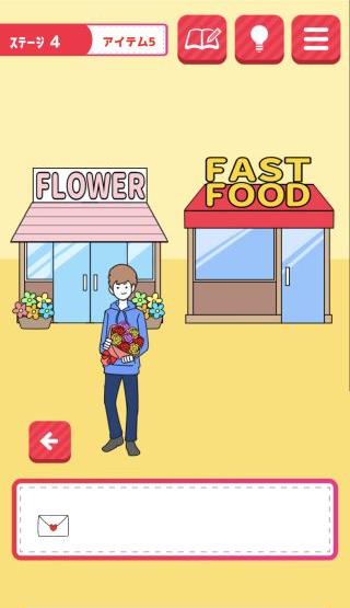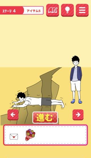 片思いからの脱出 無料 2.2 評価する 送信する MASK APP LLC アイテム5 崖に「マッチョな友達」を使う。 右に移動して、花屋に「男友達」を使う。 「花束」を入手して、左に移動。 「花束」を持たせて、「ラブレター」を渡す。 『進む』を押して、クリア。 ステージ1 アイテム1 アイテム2 アイテム3 アイテム4 アイテム5 ステージ2 アイテム1 アイテム2 アイテム3 アイテム4 アイテム5 ステージ3 アイテム1 アイテム2 アイテム3 アイテム4 アイテム5 ステージ4 アイテム1 アイテム2 アイテム3 アイテム4 アイテム5