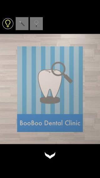 壁のポスターを拡大して、歯の右上に虫眼鏡を使っているのを確認。