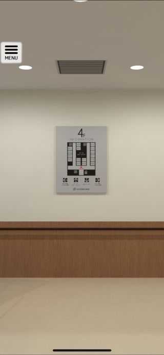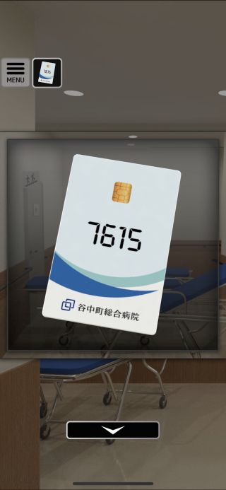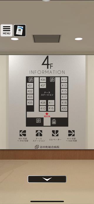 無料 評価する 送信する 非常階段の扉の開け方 スタートしたら、手前に戻る。 左のストレッチャーを拡大。 「IDカード」を入手。 裏返してQRコードをよく見ると、『上=2、左=4、右=7、下=8』となっている。 壁の案内板の下の矢印の順『左、上、下、右』の順で数字を当てはめると『4287』となる。 右奥に進んで、左奥の扉を拡大。 ロックを拡大して、『4287』を入力する。 花の選び方 箱を開けるアイテムの場所 箱の開け方 部屋番号の調べ方 エレベーターの動かし方 案内板の汚れの落とし方 母の病室の場所 非常階段の扉の開け方 薬品倉庫の開け方 薬品棚の鍵の場所 駐車料金精算機の解き方 テレビのつけ方 箱の開け方 ガラス戸の鍵の場所 スツールの開け方 照明の点け方 露天風呂のお湯の出し方 テレビの下の引き出しの開け方 冷蔵庫の開け方 ポットの開け方 マッチを使うアイテムの場所 ポットの上の壁の装置の解き方 寝室の引き出しの開け方 ポットの上の壁の装置の解き方(2回目) 電話機の謎の解き方 シャンパンをセットするまで ポットの棚の上の引き出しの開け方 ポットの棚の下の引き出しの開け方 寝室の左の引き出しの開け方 時計の謎の解き方 寝室の右の棚の開け方 メモの謎の解き方 寝室の右の引き出しの開け方 寝室の左の棚の開け方 スツールの開け方 ベッドの間の装置の解き方 ボックスの開け方と中身 和綴じの写本2の入手方法 和綴じの写本3の入手方法 和綴じの写本4の入手方法 和綴じの写本5の入手方法 和綴じの写本6の入手方法 和綴じの写本7の入手方法 明るくする方法 厨子の南京錠の開け方 厨子の左上の箱の開け方 厨子の中の右の箱の開け方 廊下の奥の扉の開け方 厨子の中の左の箱の開け方 巻物の開き方 最後の装置の解き方 キーボックスの開け方 管理室の調べ方 ブレーカーの上げ方 ロッカーの開け方 カラーコーンの奥への進み方 工具箱の開け方 エレベーター前の扉の開け方 最後の扉の開け方 形代2の入手方法 形代3の入手方法 形代4の入手方法 形代5の入手方法 形代6の入手方法 形代7の入手方法 形代8の入手方法