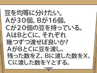 AがBとCに渡すのは、『Bに6個、Cに2個』なので、『Z=22、X=6、Y=2』となる。