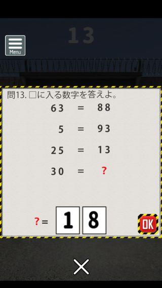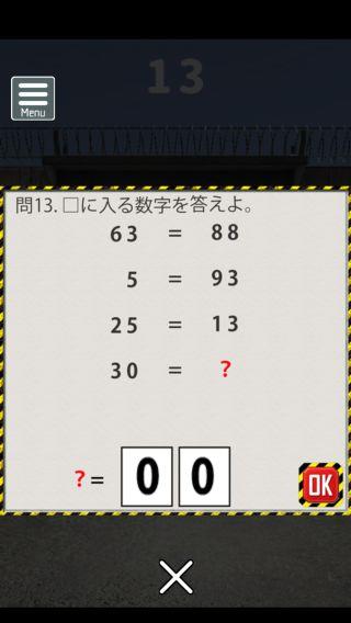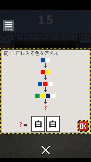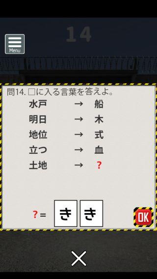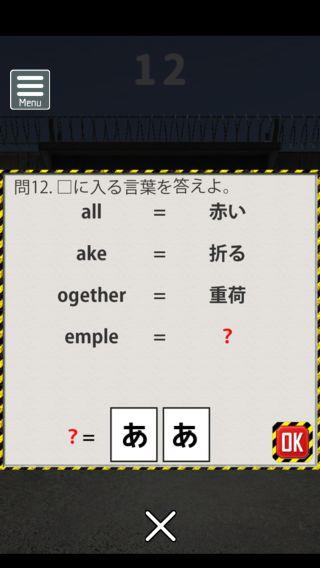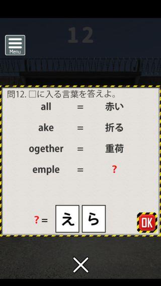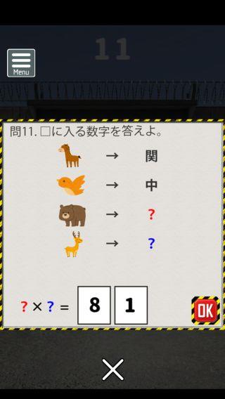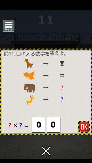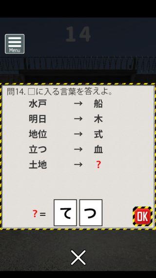 脱出ゲーム 連邦刑務所からの脱出 無料 3.8 評価する 送信する なんかいいね おまけの謎解き その2 ステージ11 『81』 ステージ12 『えら』 ステージ13 『18』 ステージ14 『てつ』 ステージ15 『赤白』 攻略その1 攻略その2 攻略その3 攻略その4 攻略その5 攻略その6 攻略その7 攻略その8 攻略その9 攻略その10 おまけの謎解き その1 おまけの謎解き その2