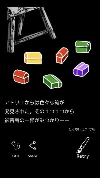 まつろぱれっと 無料 4.8 評価する 送信する SleepingMuseum DAY 4+ No.35 はこづめ 「はこ」の色を『青色』以外で塗る。 No.36 はい 彼女の手に「ひのついた らんぷ」を置いて、『赤色』か『黄色』で塗る。 No.37 かみなり 「まど」の色を『灰色』で塗る。 DAY 1 攻略その1 攻略その2 DAY 2 攻略その1 攻略その2 DAY 3 攻略その1 攻略その2 DAY 4 攻略その1 攻略その2 DAY 1+ 攻略その1 攻略その2 DAY 2+ 攻略その1 攻略その2 DAY 3+ 攻略その1 攻略その2 DAY 4+ 攻略その1 攻略その2 DAY 5 攻略その1 攻略その2 DAY 6 攻略その1 攻略その2 DAY 7 攻略その1 攻略その2 死に様ギャラリー DAY 1 DAY 2 DAY 3 DAY 4 DAY 1+ DAY 2+ DAY 3+ DAY 4+ DAY 5 DAY 6 DAY 7