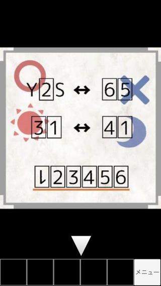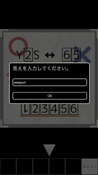 WHERE(脱出ゲームメーカー) 無料 2.3 評価する 送信する Springboard Inc. 青の謎 スタート地点から右の部屋へ。 2の左の部屋に入って、床の謎を調べる。 『YES⇔NO、AM⇔PM』となり、1は逆になっているので『M→W』として答えは『WEAPON』となる。 『weapon』を入力する。 『弓の絵』を確認。 赤の謎 緑の謎 青の謎 黄の謎 最後の謎