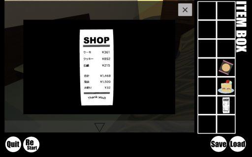 「レシート」を入手して、『ケーキ=¥361、クッキー=¥892、石鹸=¥215』を確認。