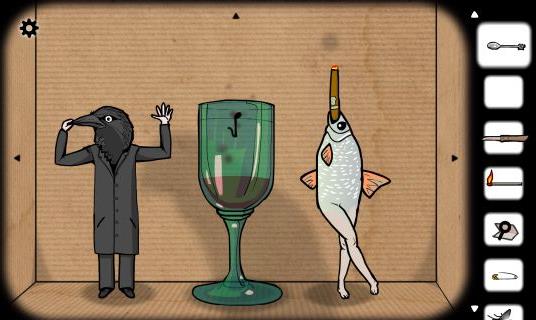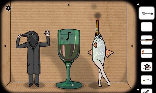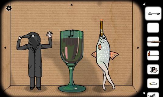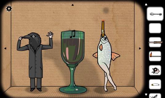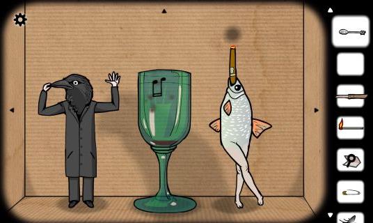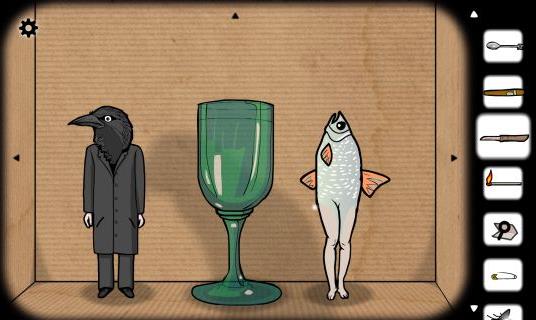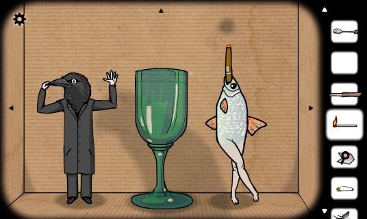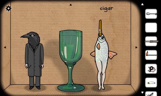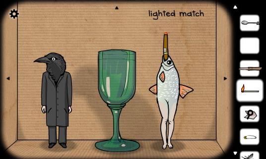 右に魚に「葉巻」を咥えさせて、「火のついたマッチ」で火をつける。